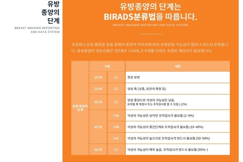 1단계 C1/정상유방 2단계 C2/양성혹(낭종, 유관확장 등) 3단계 C3/양성종양으로 악성 가능성 낮음(6개월 후 재검사 또는 조직검사 가능함. 2%) 4단계 C4A / 악성 가능성은 낮으나 조직검사 필요(2~9%) C4B / 악성 가능성은 중간 단계에서 조직검사 필요(10~49%) C4C / 악성 가능성이 높기 때문에 조직검사가 반드시 필요함(50~94%) C5 / 악성 가능성이 매우 높다. 조직검사 꼭 필요(95%~)