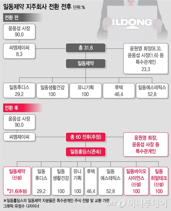 일동 제약 오너 일가가 현재의 튼튼한 지분율을 구축한 것은 일동 제약·일동 홀딩스의 분할과 지주 회사 전환이 큰 역할을 했다. 큰돈을 들이지 않고 지주 회사 전환 작업에서 현 오너 일가의 지분율은 30%대에서 60%로 크게 돌아섰다. 지주 회사 체제 구축까지의 과정은 순탄치 않았다. 일동 제약은 2번의 시도 끝에 지주 회사 체제로의 전환에 성공했다. 첫 시도는 2014년에 전개됐다. 일동 제약은 2013년 10월 이사회에서 인적 분할 안건을 통과시키면서 2014년 주총을 통해서 최종 확정할 계획이었다. 일동 제약 오너의 입장에서 인적 분할을 단행할 경우 지주 회사를 활용하여 사업 회사의 경영권을 강화할 수 있다. 분할 전에 법인의 자사주(3.32%)가 투자 회사의 사업 회사 지분으로 바뀐다”지주 회사 마법”효과를 누릴 수 있기 때문이다. 분할 전에는 의결권이 없는 주식이지만 지주 회사 체제로 바뀌면 사업 자회사의 의결권으로 바뀐다. 그러나 이런 계획은 동종 업계의 경쟁 업체인 녹십자 그룹과 경영권 분쟁을 일으키다 예상하지 못한 결과를 낳았다. 녹십자 그룹은 인적 분할을 위한 임시 주주 총회 직전 주식을 사들이고 일동 제약의 지분을 29.36%까지 끌어올렸다. 당시 일본동 제약의 윤·우오뇨은 회장 등 총수 일가 지분이 34.16%였던 것과 비교하면 차이가 4.8%로 매우 적고 오너 일가는 매우 위협적인 존재였다.결국 일동 제약 지주 회사 설립 1차 시도는 불발에 그쳤다. 많은 주주들이 임시 주주 총회에서 기업 분할 계획에 반대 표를 던지면서 통과 요건을 채우지 못 했다. 그 후도 녹십자는 일동 제약의 다른 주주 총회에서 자신들에게 유리한 인물을 이사로 선임하는 등 주주 제안 안건을 일동 제약에 전달하고 오너 일가와 표 대결을 계속했다. 그런 2015년, 일동 제약은 녹십자와 극적으로 관계를 풀고 2차 지배 구조 개편 시도에 나선다. 녹십자 홀딩스, 녹십자 셀은 보유하고 있던 지분 전량(735만 9773주)을 윤·우오뇨은 회장에 매각했다. 이를 다시 사모 펀드 H&Q코리아(주주 이름=선 라이즈 홀딩스)등이 인수하면서 양측의 경영권 분쟁은 일단락됐다.일동 제약은 그 뒤 다시 기업 분할 때문에 이사회 의결, 주주 총회를 거치면서 결국 지분 구조를 투자 회사(닛토 홀딩스), 사업 회사(일동 제약)에 분할하는 방안을 최종 통과했다.기업 분할 후부터는 모든 과정이 속전 속결로 진행됐다. 닛토 홀딩스는 지주 회사 체제를 좀 더 명확히 하기 위한, 일동 제약의 주주로부터 일동 제약 주식의 현물 출자 신청을 받고 그 대가로 현물 출자를 한 주주들 일동 홀딩스의 신주를 발행하는 유상 증자를 단행했다. 여기에 오너 일가가 대거 참여하고 일동 제약의 지분을 넘기는, 일동 홀딩스의 지분을 대량 확보했다.일련의 과정을 거친 뒤 총수 일가의 지배 구조상 핵심 회사의 지분율은 지배 구조 개편 작업 전에 34%(분할 전에 일동 제약)에서 작업을 마친 뒤 68.22%(닛토 홀딩스 지분율, 선 라이즈 홀딩스 포함)까지 높아졌다. 일동 홀딩스도 역시 사업 회사 일동 제약의 지분 60%대를 보유하고 있으며, 사실상 경영권 분쟁에서 자유롭지 안정적 지배 구조 구축이 가능하게 됐다. 현재 일동 제약 그룹은 “CMJC, 윤·우오뇨은 회장 등 총수 일가(46.6%)→ 일동 홀딩스(40.94%)→ 일동 제약에 이어지는 지분 구조를 갖고 있다.